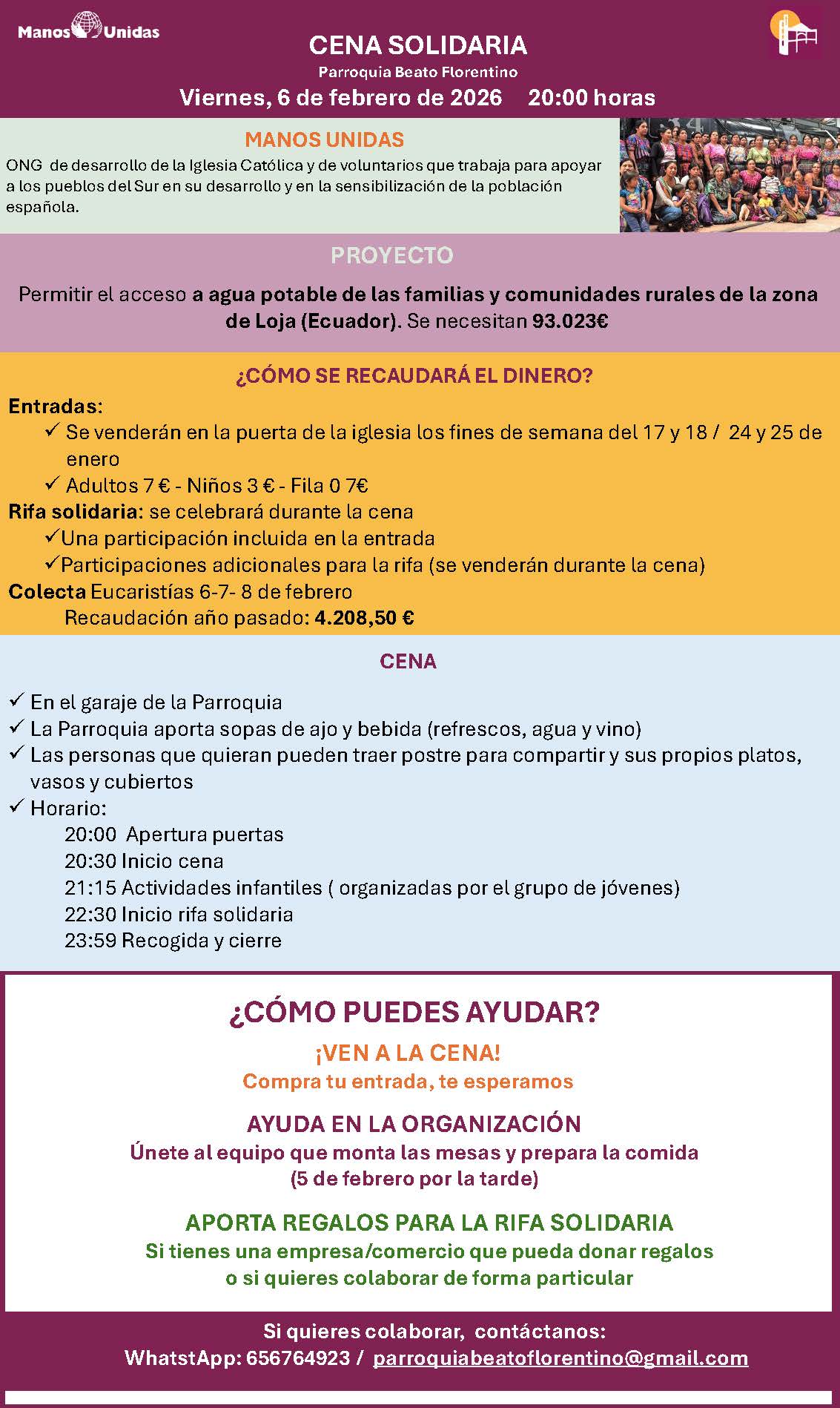 MANOS UNIDAS 2026 Miguel Ángel Núñez IglesiasEne 11, 2025Ene 17, 2026 Los día 7 y 8 de febrero celebramos la compaña de Manos Unidas El viernes 6 de febrero celebraremos la cena solidaria en favor del proyecto de Mozambique de Manos Unidas. <span class="nav-subtitle screen-reader-text">Página</span> Siguiente entradaPLAN PASTORAL DIOCESANO Entradas relacionadas SEMANA DE ORACIÓN POR LA UNIDAD DE LOS CRISTIANOS Celebramos la semana de oración por la unidad de los... Miguel Ángel Núñez IglesiasEne 17, 2026Ene 17, 2026 Aportación a la parroquia por suscripción bancaria El sostenimiento de la parroquia y la transparencia en la... Miguel Ángel Núñez IglesiasDic 17, 2025Dic 20, 2025 PLAN PASTORAL DIOCESANO Como cada año la Diócesis plantea un plan para el... Miguel Ángel Núñez IglesiasSep 17, 2025Sep 17, 2025
